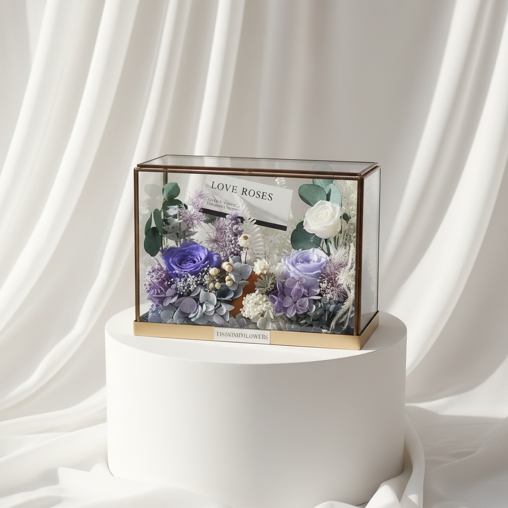 A mix of preserve flowers in a glass case